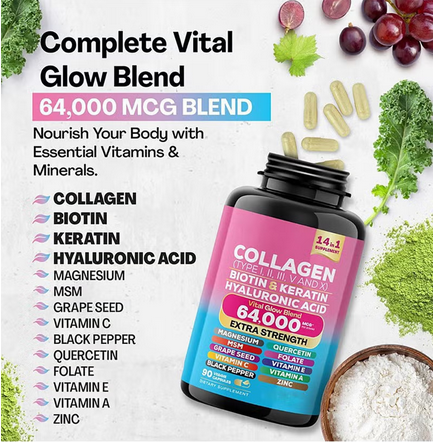هل تبحثين عن منتج يعزز جمالك ويجعل بشرتك تتألق؟ نقدم لك كبسولات الكولاجين المميزة مع البيوتين والكيراتين وحمض الهيالورونيك، مكمل غذائي متكامل مصمم خصيصًا للنساء. تمتع بالفوائد الصحية والجمالية مع تركيبة تحتوي على 5 أنواع من الكولاجين!